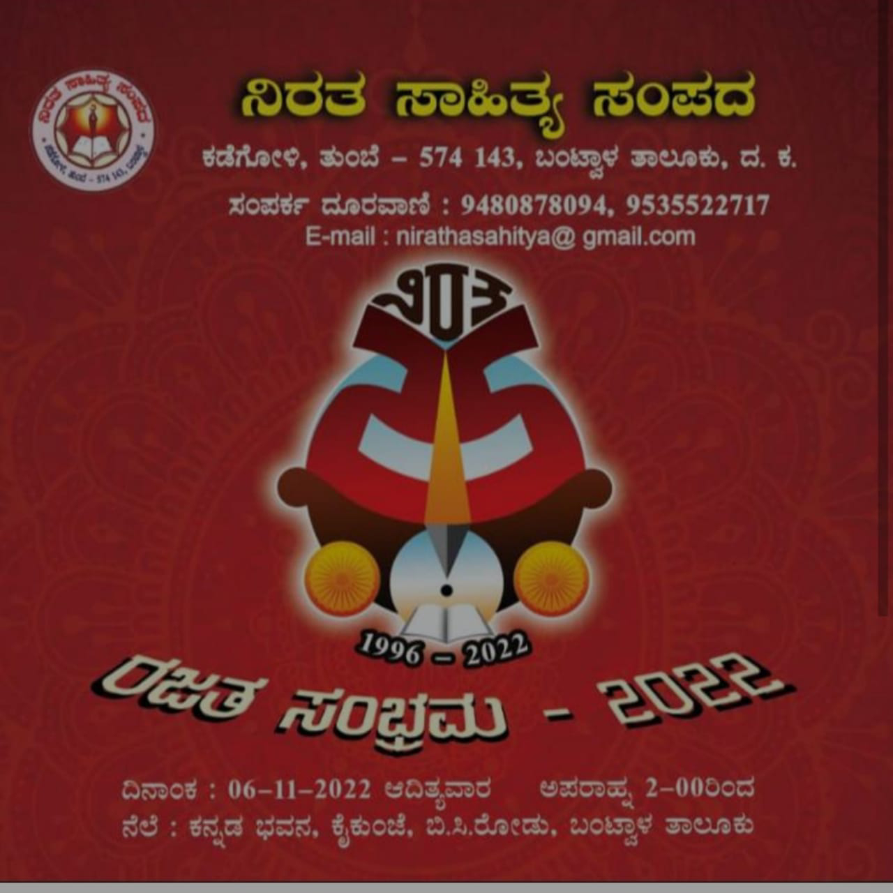 ಬಂಟ್ವಾಳ: ನಿರತ ಸಾಹಿತ್ಯ ಸಂಪದ ಕಡೆಗೋಳಿ, ತುಂಬೆ ಇದರ ಬೆಳ್ಳಿಹಬ್ಬ ನ. 6ರಂದು ಬಿಸಿ ರೋಡ್ನ ಕೈಕುಂಜೆಯ ಕನ್ನಡ ಭವನದಲ್ಲಿ ನಡೆಯಲಿದೆ.